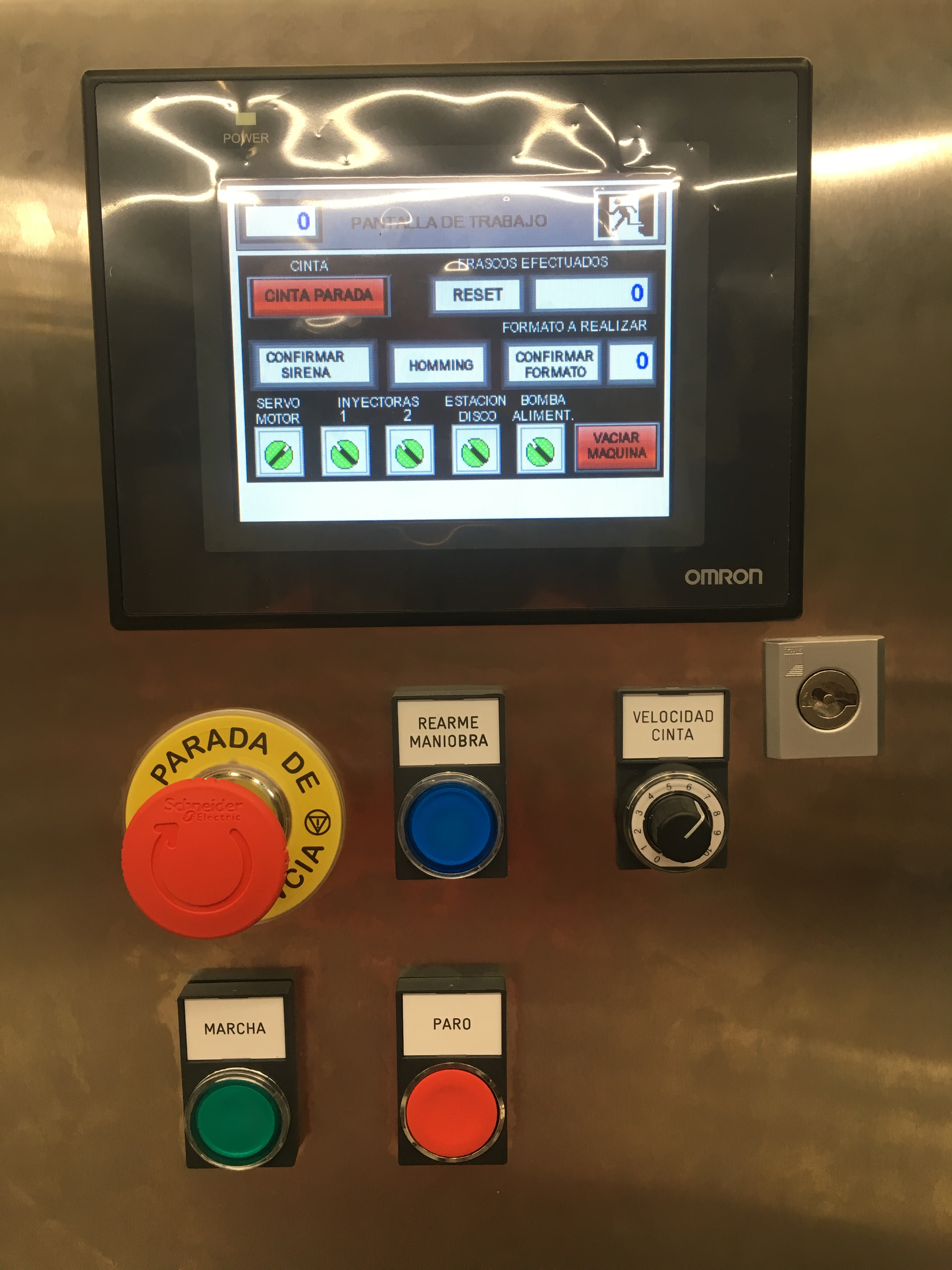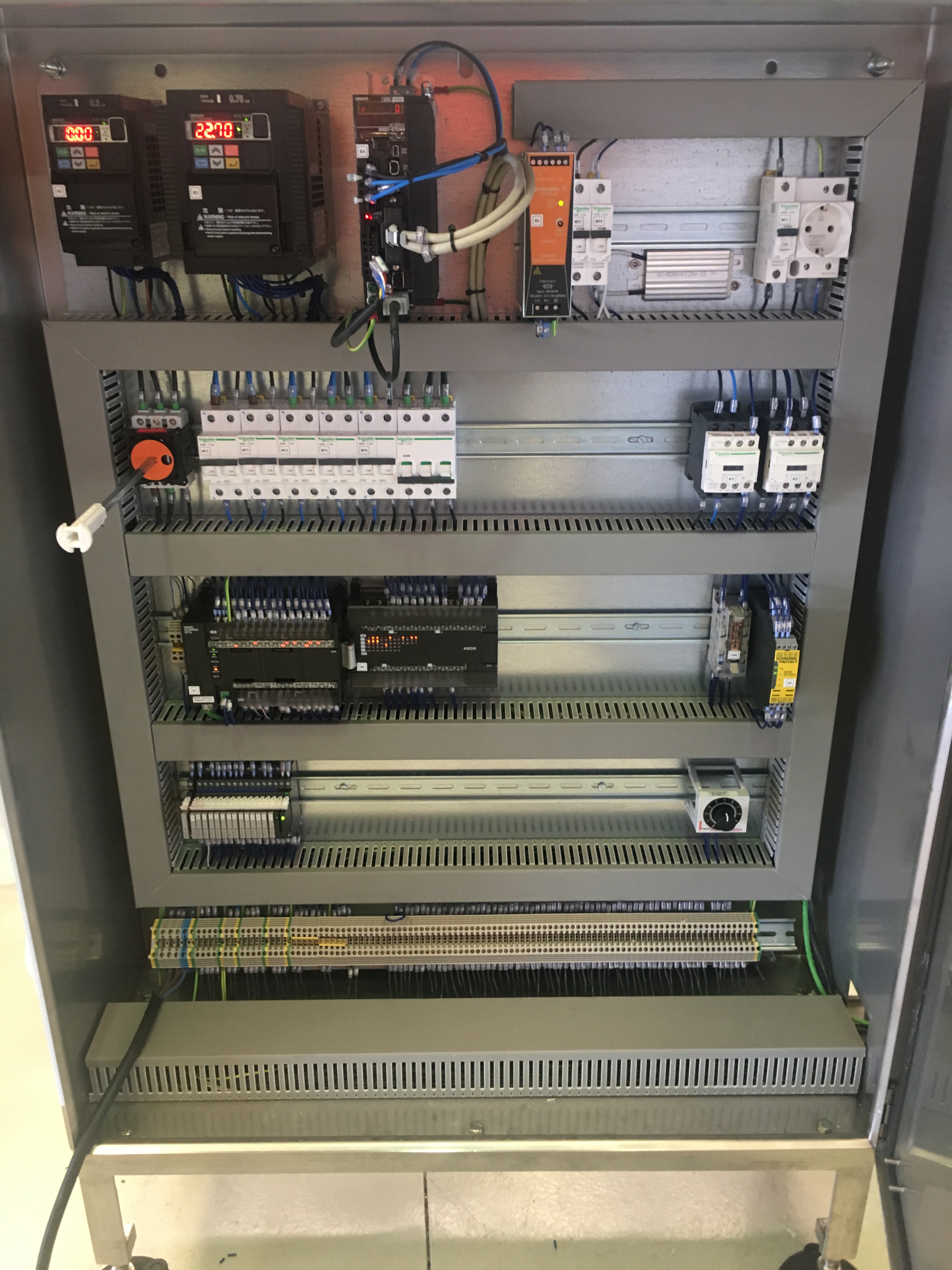 La regulación de velocidad de los motores del transportador de entrada y la estrella de la máquina se han realizado mediante variadores de frecuencia MX2 de la firma Omron. El movimiento de la boquilla de dosificación se ha realizado mediante un motor servo controlado por un driver de la marca Omron y un PLC de control que gestiona todas las operaciones.